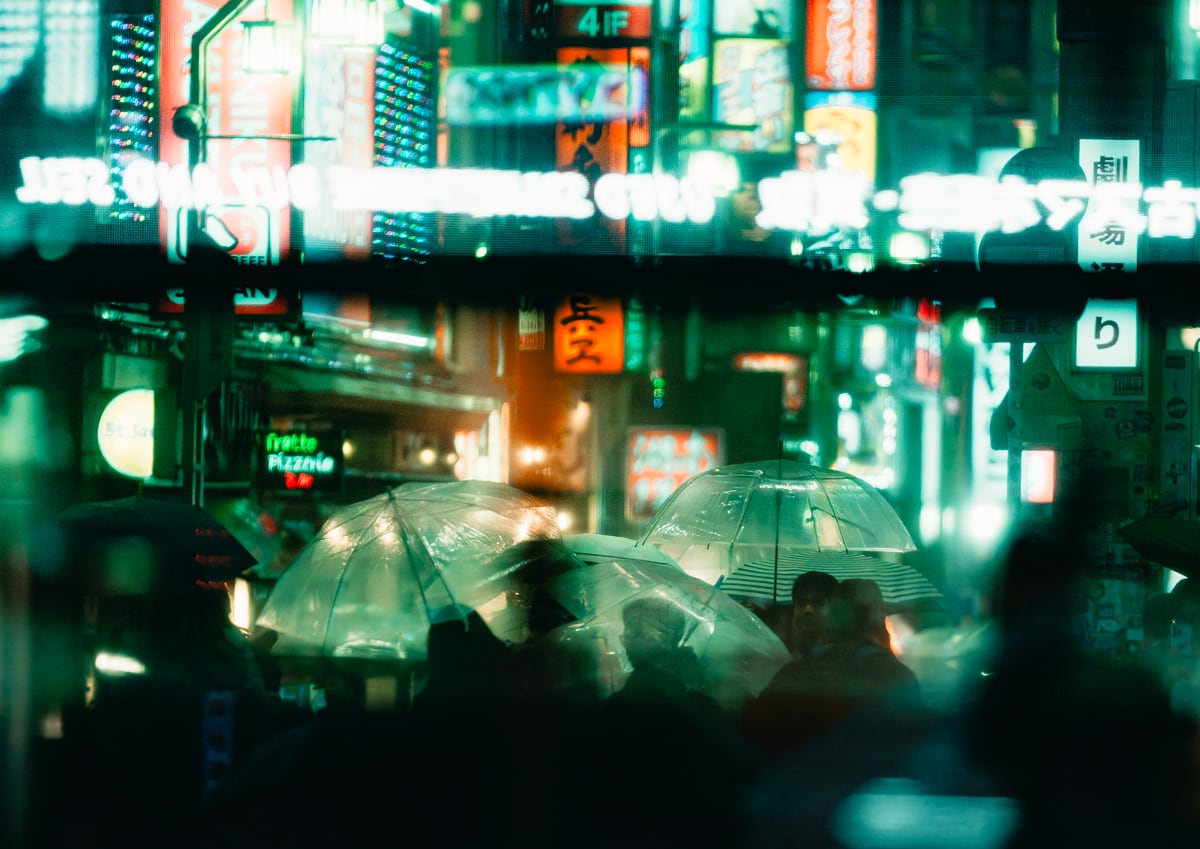 Shinjuku Kabukicho Ichiban-gai. Captured the people passing through the street and the scenery unfolding behind them, using a large bus speeding by from the right as a filter. A swarm of umbrellas, reflections of letters, the bus's frame. This work captures an extraordinary scene—a fleeting moment of the extraordinary emerging amidst the city's bustle—where different coincidences overlap.