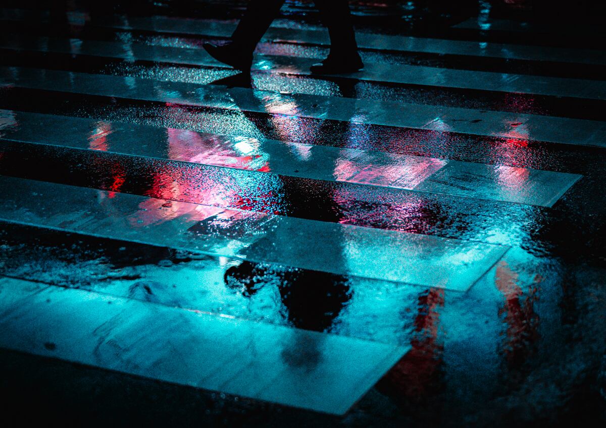 雨上がりの新宿。濡れた横断歩道に、赤と青のネオンが滲みながら反射していた。その光はまるで色彩パレットのように映り、歩行者の影をシルエットとして重ねることで、都市の雑踏がひとつの絵画のように浮かび上がった。